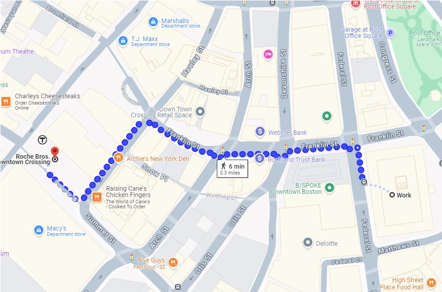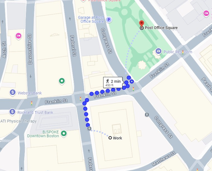 100 Federal Street has a Walkscore of 99/100, which means daily errands for clients do not require a car. For your convenience we have provided direction to the nearest offsite outdoor space, Post Office Square, and the nearest grocery store, Roche Bros., both are within a half mile walking distance from the building.